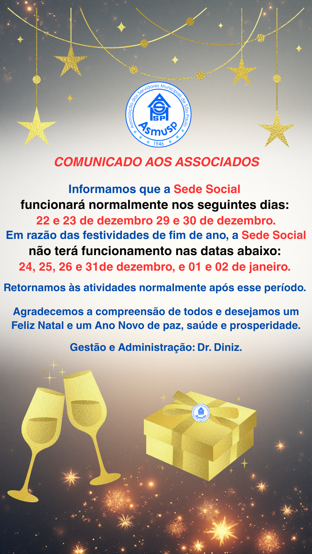 COMUNICADO AOS ASSOCIADOS À Asmusp deseja a todos os Associados, Boas Festas e um Feliz Natal e um Próspero Ano Novo!!! Gestão e Administração: Dr.Diniz/2025.