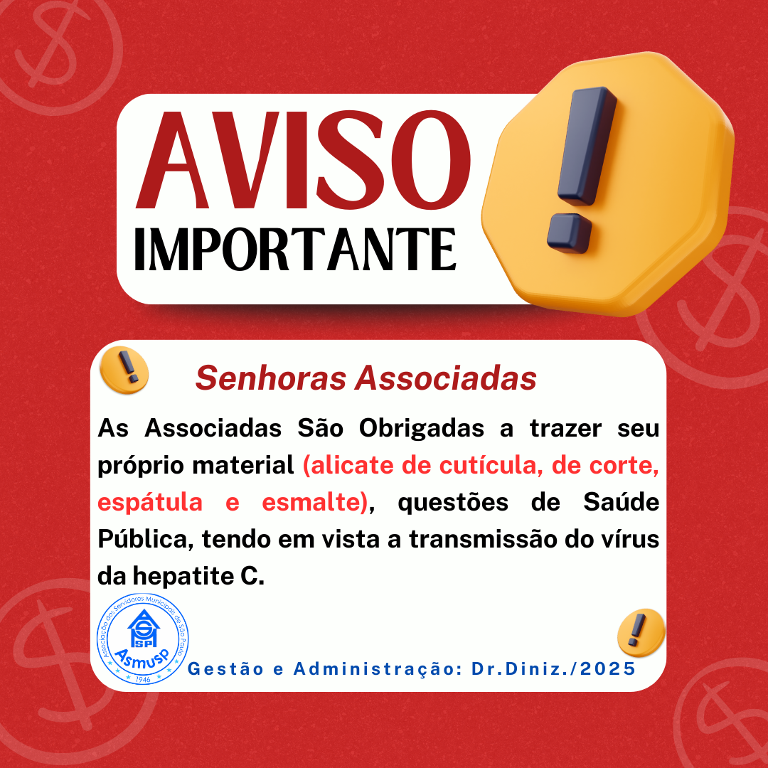 COMUNICADO AOS ASSOCIADOS Informamos que a Sede Social não terá expediente no dia 12/12/2025, após às 12h, devido a processos internos. Agradecemos a compreensão de todos! Gestão e Administração: Dr.Diniz/2025.